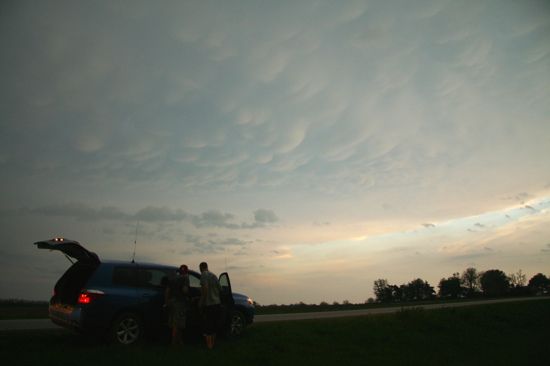 Mammatus clouds hang under the anvil of the storm on sunset. South of Fredonia, Kansas.