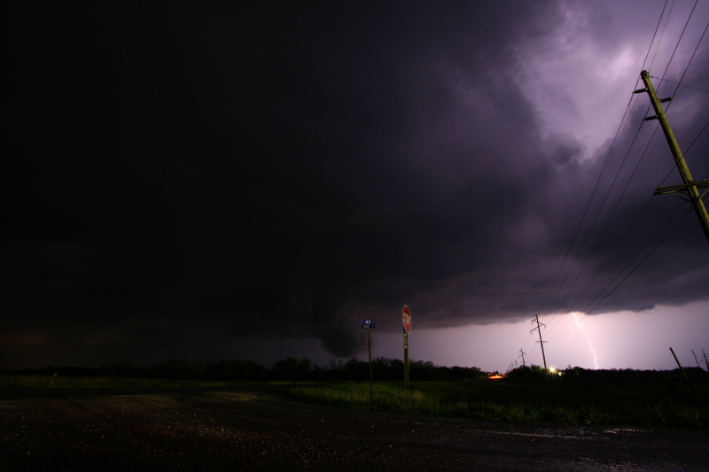 Lightning lights up a wall cloud well after dark near Moran, Kansas.