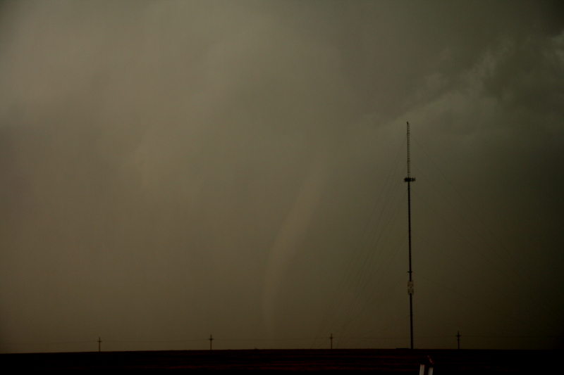 Just north of Grainfield, we watched as the funnel dropped down again and emerged from the rain as this awesome slender elephant trunk tornado.