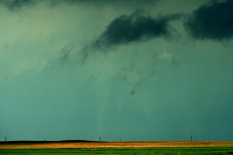 About 10 minutes later, we saw another tornado emerge from the rain. This photo has been heavily contrast adjusted but you can make it out above the left of the two power poles.